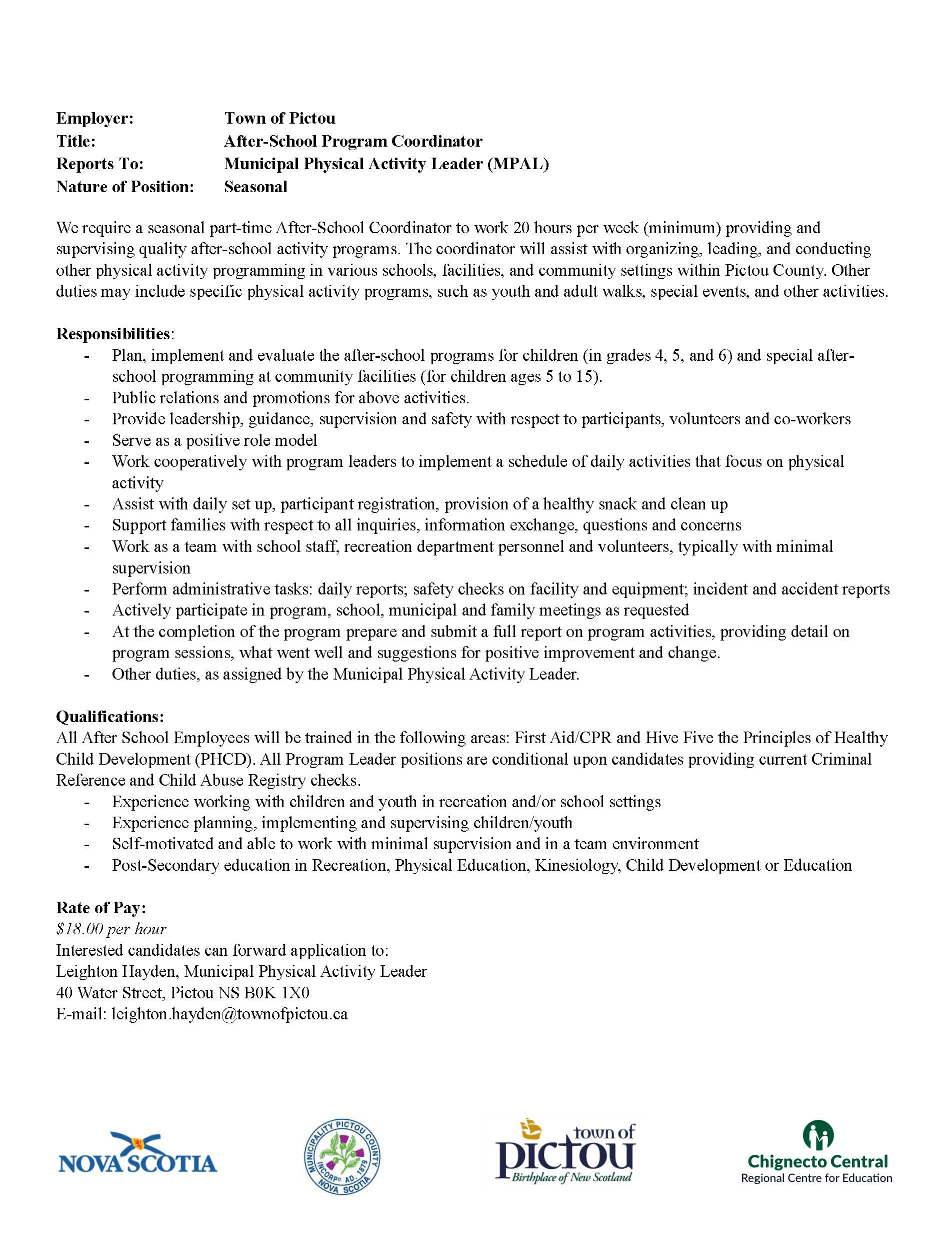 Active Pictou County After School Coordinator Description 2023 Updated Oct 17