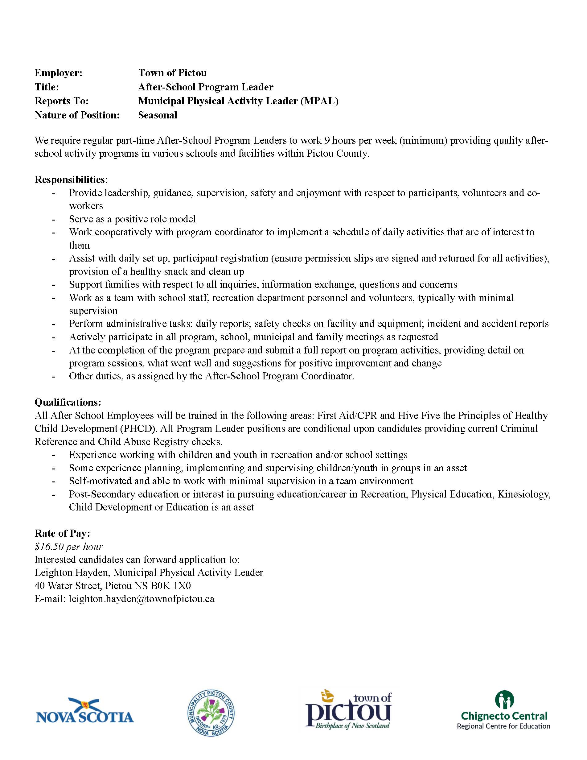 Active Pictou County After School Leader Description 2023 Updated Oct 17